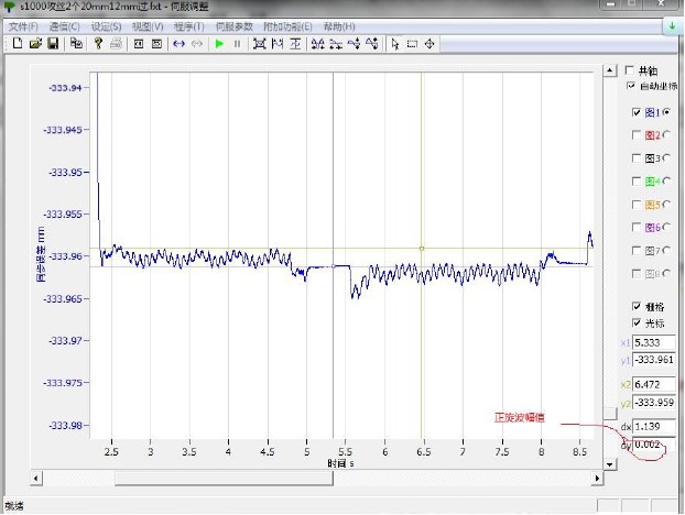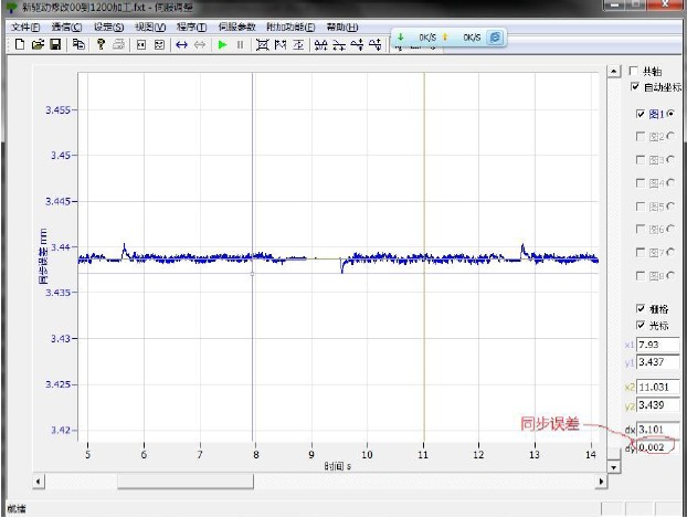 ????? 圖中同步誤差的最大值為0.002mm,Z軸電機特性正旋波幅值被控制在0.001mm以內。