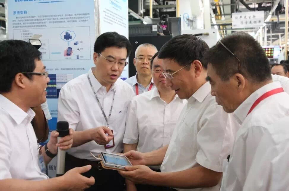 華中數控陳吉紅董事長向苗圩部長和周濟院長匯報車間大數據、機床健康保障、斷刀檢測、工藝參數優化、二維碼故障診斷等智能功能