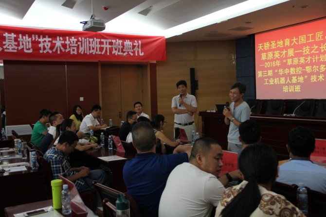 “天驕?zhǔn)サ赜髧そ常菰⒉耪挂患贾L。”7月25日-8月4日,華中數(shù)控與鄂爾多斯職業(yè)學(xué)院合辦的“2016草原英才計劃”——工業(yè)機器人培訓(xùn)班在內(nèi)蒙古鄂爾多斯職業(yè)院校成功舉辦。來自廣州工程技術(shù)職業(yè)學(xué)院、河北工業(yè)職業(yè)技術(shù)學(xué)院、武漢軟件工程職業(yè)學(xué)院、福建工業(yè)學(xué)校、衡水學(xué)院、遼寧建筑職業(yè)學(xué)院等近20所院校的四十余名教師參加了本次培訓(xùn),普遍反映收獲很大,感謝華中數(shù)控和鄂爾多斯職業(yè)學(xué)院共同提供了很好的學(xué)習(xí)平臺,針對工業(yè)機器人的教學(xué)和實訓(xùn),大家共同研討、共同學(xué)習(xí)。培訓(xùn)期間,各位老師對鄂爾多斯這塊神奇的地方、天驕?zhǔn)サ亓粝律羁逃∠螅惺艿絻?nèi)蒙古獨特的文化魅力和自然風(fēng)景。
