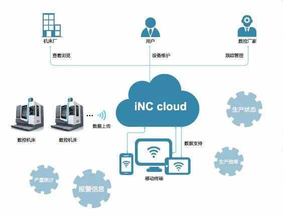 華中數控iNC-Cloud在工業互聯網、大數據、云計算、新一代人工智能技術的基礎上,建立安全可靠、高效智能的云數據中心,通過大數據智能分析、數據統計、數據可視化等技術,實現生產過程的智能監控、維護與管理。用戶可以通過移動終端,隨時了解設備的生產狀態、生產效率、產量統計、報警信息等,享受專業、智能、安全的跟蹤服務,分享制造過程中生產管理、設備維護等先進經驗,從而提高企業的核心競爭能力。