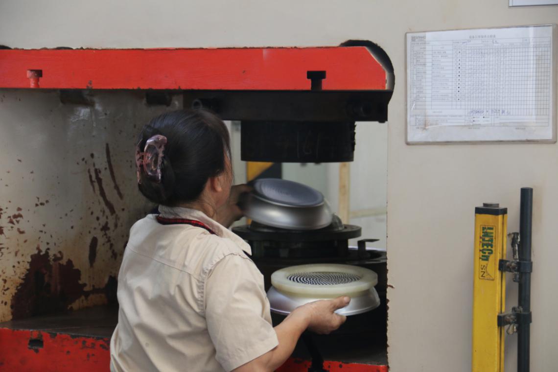 鍋具打磨以前是靠工人一件件的手工打磨,粉塵多,噪音高,勞動環境非常惡劣,你看那位坐在角落里的小哥哥了嗎,他正在給鍋具打磨,給他點贊,但同時也替他擔心。