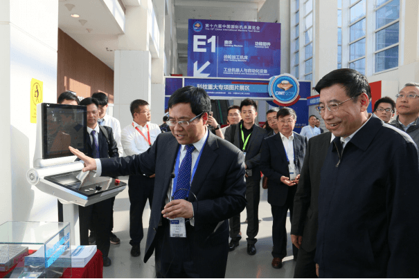 陳吉紅董事長向中國機械工業(yè)聯(lián)合會王瑞祥會長、中國機床工具工業(yè)協(xié)會常務副理事長毛予鋒、中國工程院原院長周濟院士等來訪貴賓介紹華中數(shù)控最新產(chǎn)品及技術